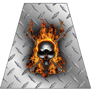 SK-SKULL-3S: Molten lead skull on fire on diamond plate reflective fire helmet tetrahedrons (2 inch - set of 8)